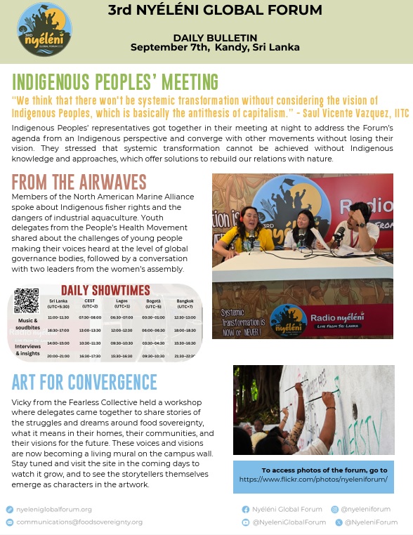 If you would like to know more about the Third Nyéléni Forum and its areas of convergence (1 – democracy and peoples rights, peace and internationalist solidarity; 2 – peoples economies; 3 – food sovereignty and agroecology; 4 – secure land, water, territories and agrarian reform; 5 – health for all; 6 – climate justice and energy sovereignty), we recommend listening to the live broadcasts on Nyéléni Radio, featuring interviews with various representatives of social movements, organisations and communities.